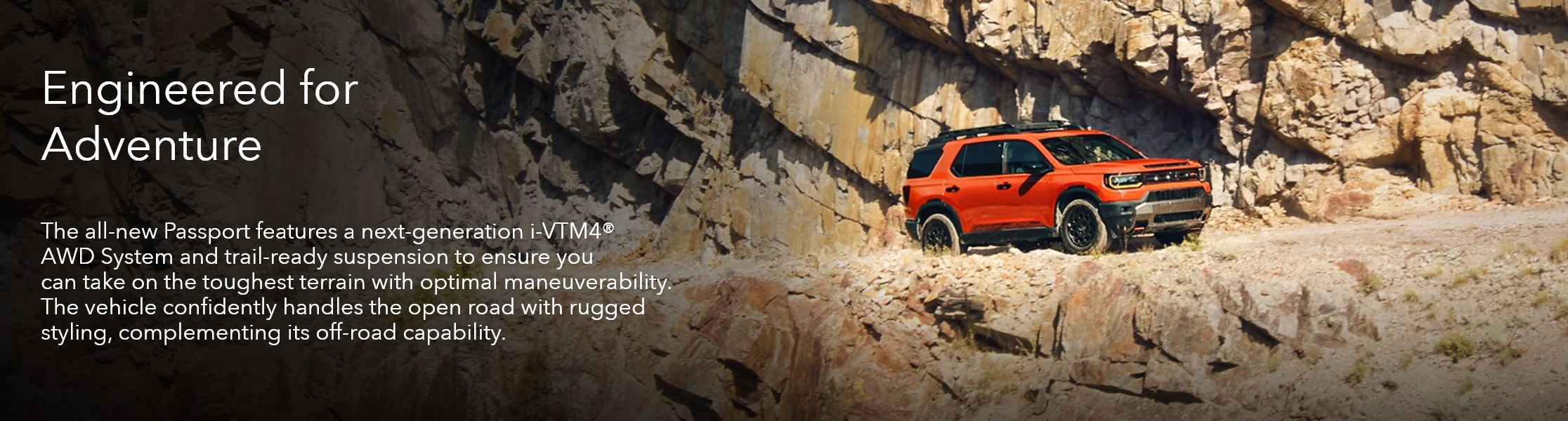 Introducing the all-new Passport, now fueled with even more rugged capability and powered by a next-generation 3.5L DOHC V6 engine. Featuring confidence-inspiring on-road and off-road dynamics, the 2026 Passport is ready to help you explore. Seek out tougher terrain with the most capable Honda SUV yet, coming early 2025. Starting in the mid-$40,000 range.