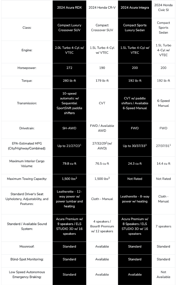 To get a sense of the specs and features between brands, review this chart that compares key Acura vs. Honda models: