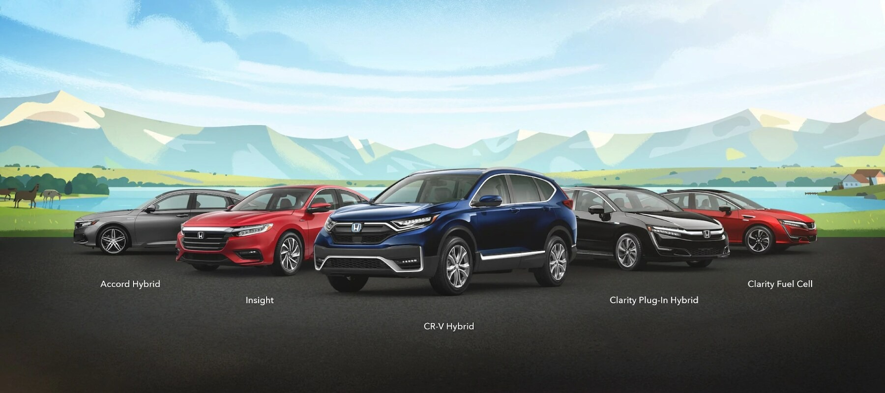 2021 Honda Accord Hybrid shown in Modern Steel Metallic, 2021 Insight shown in Radiant Red Metallic, 2020 CR-V Hybrid shown in Obsidean Blue Pearl, 2021 Clarity Plug-In Hybrid shown in Crystal Black Pearl and 2021 Clarity Fuel Cell shown in Crimson Pearl (not available at Tracy Honda).